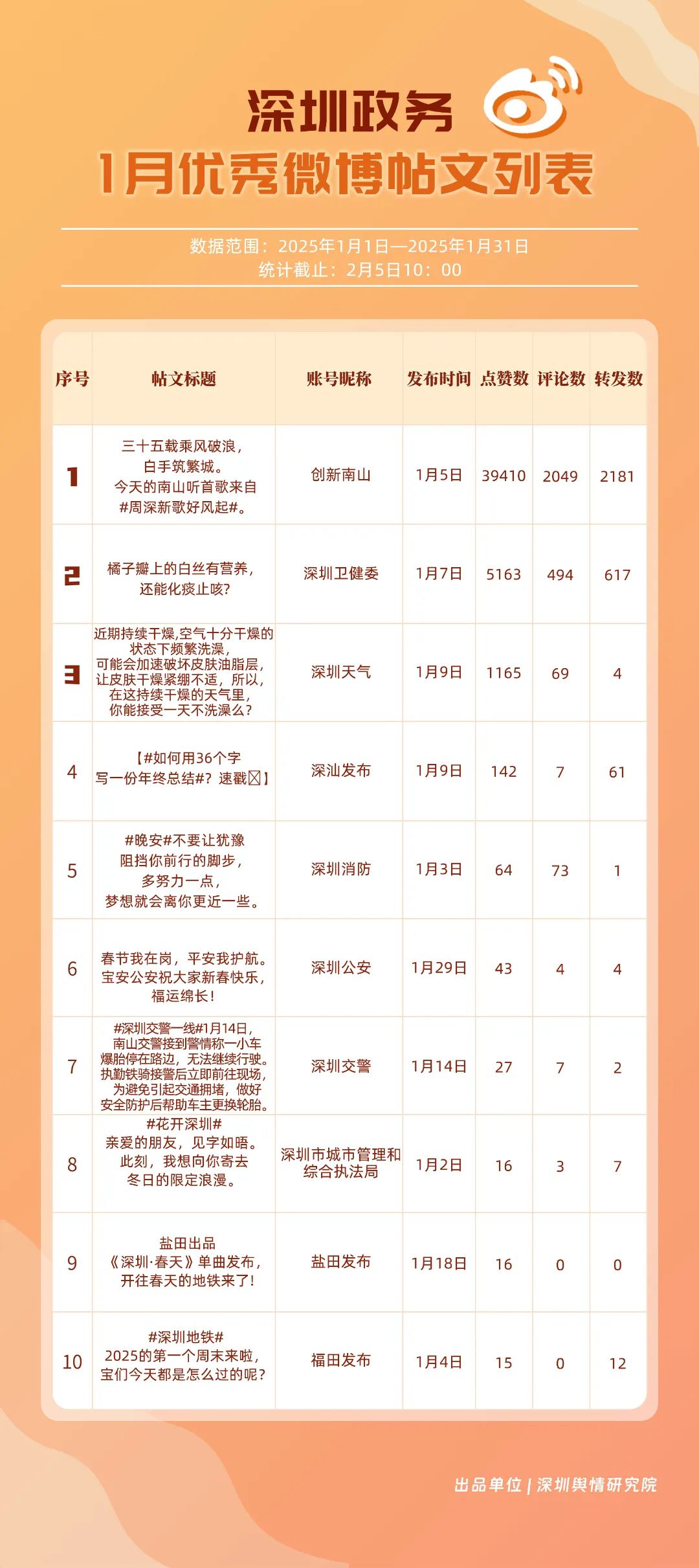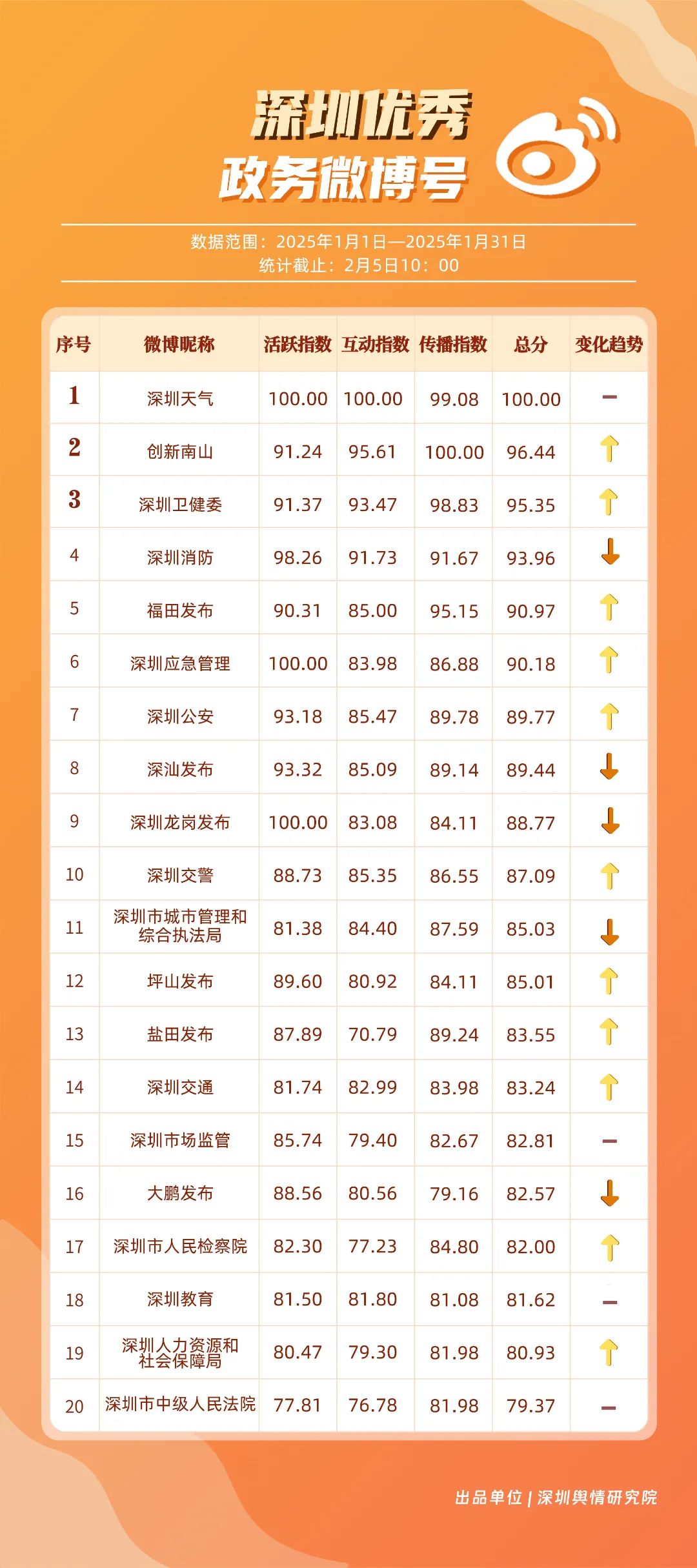 1月,“深圳天氣”“創(chuàng)新南山”“深圳衛(wèi)健委”“深圳消防”“福田發(fā)布”“深圳應(yīng)急管理”“深圳公安”“深汕發(fā)布”“深圳龍崗發(fā)布”“深圳交警”等20個賬號入選“優(yōu)秀政務(wù)微博號”。“深圳天氣”憑借高活躍度、互動量等獲得滿分,“創(chuàng)新南山”“深圳衛(wèi)健委”賬號則在1月發(fā)力宣傳,排名上升至榜單第二、三位。同時,“深圳消防”“福田發(fā)布”“深圳應(yīng)急管理”賬號總分在90分以上,彰顯了他們在提升公眾安全意識、促進政民互動等方面所做出的積極貢獻。
