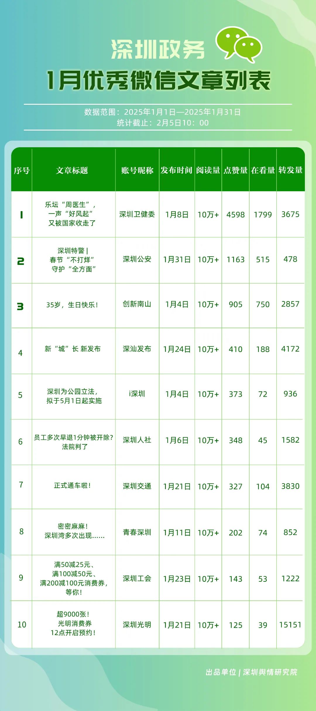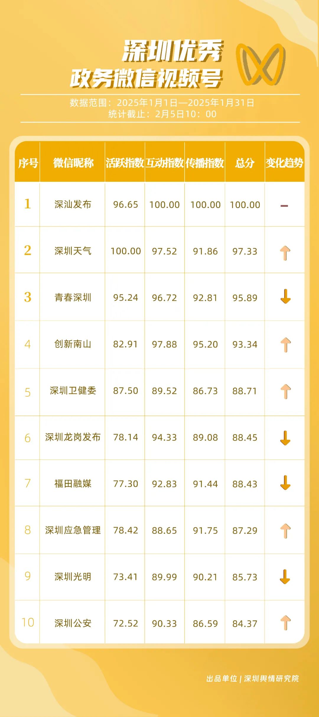 2025年1月期《深圳優(yōu)秀政務(wù)新媒體矩陣》發(fā)布,一同揭曉哪些政務(wù)新媒體矩陣能夠憑借其卓越表現(xiàn)脫穎而出,成為推動政務(wù)信息傳播與服務(wù)模式創(chuàng)新的領(lǐng)航者,引領(lǐng)政務(wù)新媒體運營邁向新高度。