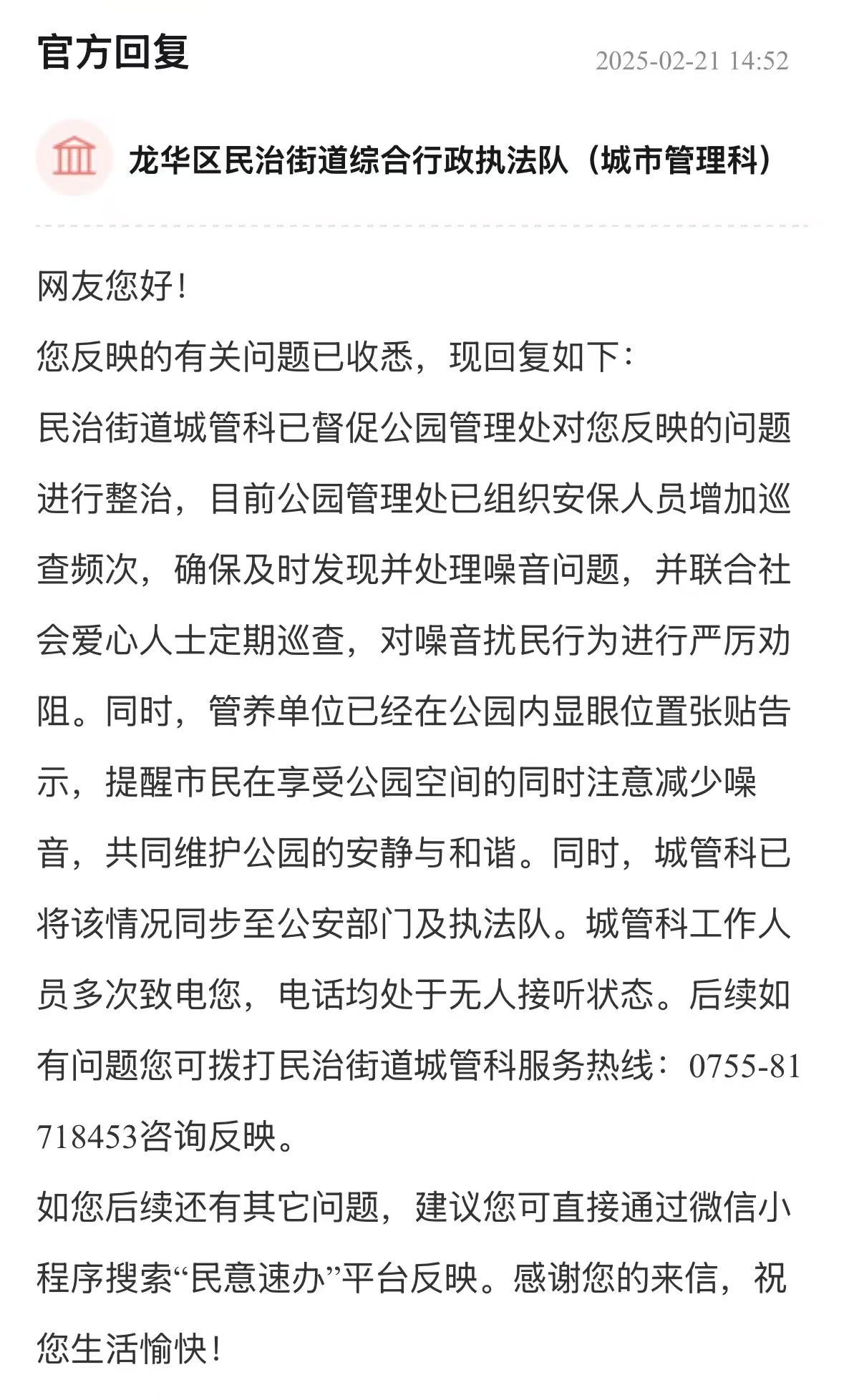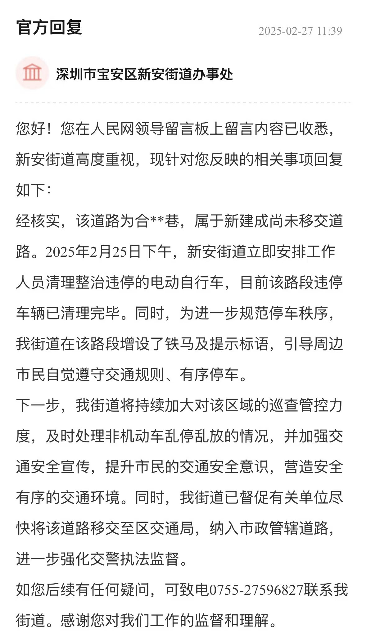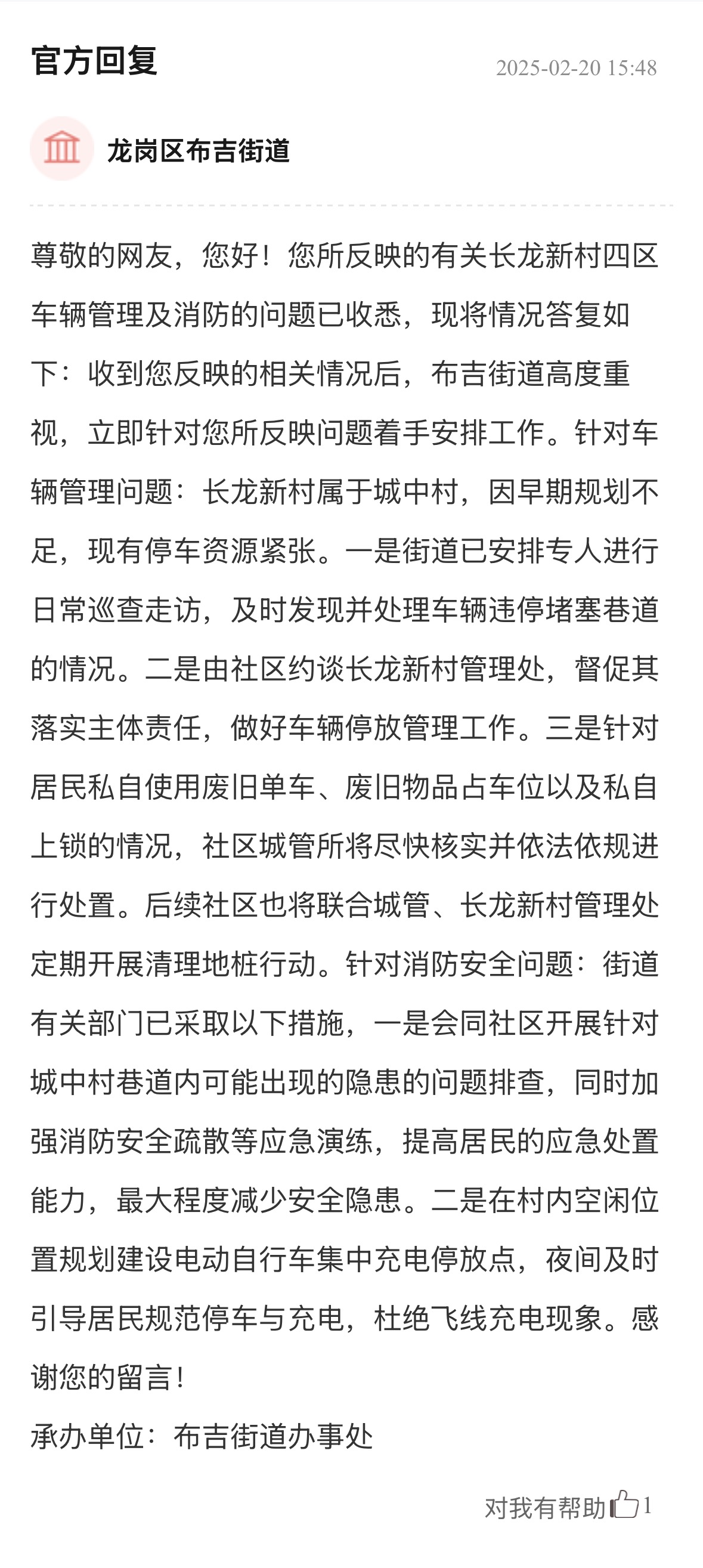 案例點評:街道辦針對車輛管理、消防問題多管齊下,旨在營造一個通暢、安全的出行和生活環(huán)境,態(tài)度值得肯定。回應展示了街道辦構建的“專項巡查+設施建設+行為引導”綜合治理體系,精準直擊問題核心,兼顧當下整治與長遠規(guī)劃,切實保障居民居住和生活安全,其系統(tǒng)性解決思路對同類區(qū)域治理具有重要參考價值。