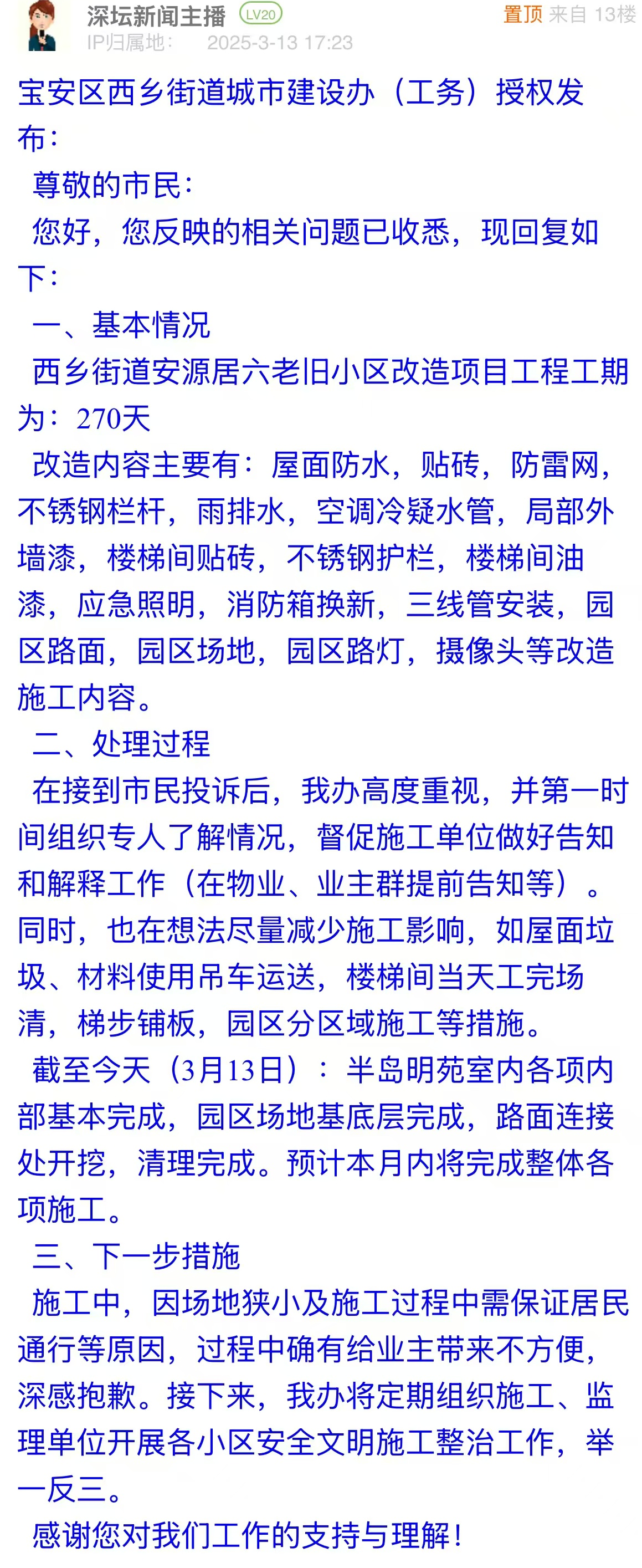 案例點評:市民投訴后,街道辦快速介入,做好信息公開及解釋工作,表示工程正在穩(wěn)步推進,并協(xié)助優(yōu)化施工流程,體現(xiàn)了主動作為的態(tài)度,保障居民知情權與參與權。回應中,街道辦還承諾將舉一反三,減少類似問題出現(xiàn),是對未來工作的深遠規(guī)劃,真正為民生工程贏得群眾滿意而努力,值得推廣。