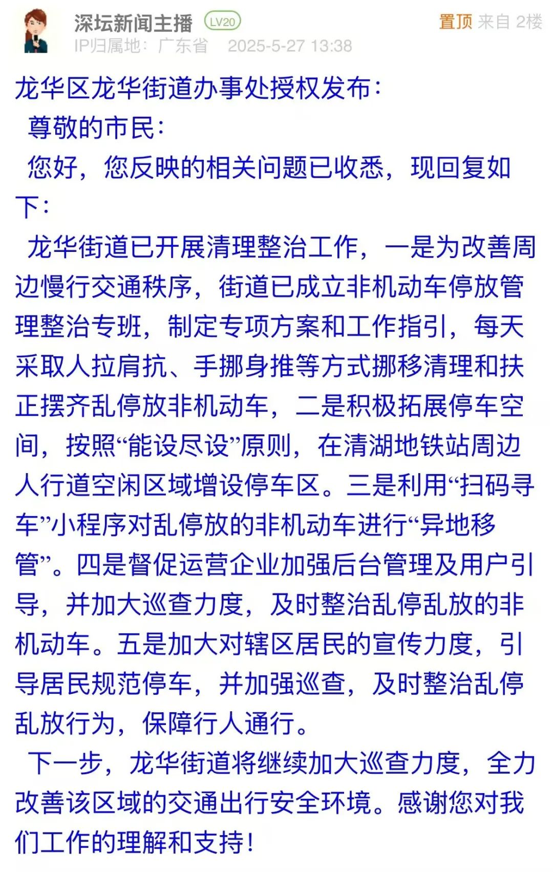 案例點評:地鐵口電動車與共享單車堆積,既阻礙行人通行,更影響區(qū)域交通秩序與城市形象。龍華街道辦接訴后迅速響應(yīng),成立專項整治專班,通過每日清理扶正、增設(shè)停車區(qū)、“掃碼尋車”移管、督促企業(yè)巡查及居民宣傳引導(dǎo)等多維度舉措,破解亂停難題,以“疏堵結(jié)合”的治理智慧,快速行動,綜合施策,為改善區(qū)域交通環(huán)境提供了務(wù)實范本。