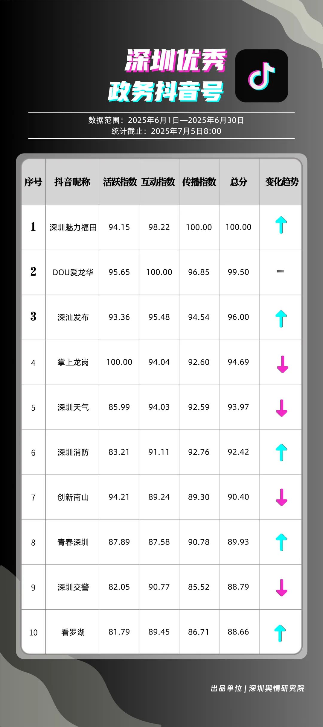 6月,“深圳魅力福田”“DOU愛龍華”“深汕發(fā)布”“掌上龍崗”“深圳天氣”“深圳消防”“創(chuàng)新南山”“青春深圳”“深圳交警”“看羅湖”共10個(gè)政務(wù)抖音號(hào)獲得“優(yōu)秀政務(wù)抖音號(hào)”稱號(hào)。6月,“深圳魅力福田”登頂,憑借其城市人文、社會(huì)熱點(diǎn)類主題短視頻,在傳播指數(shù)得分創(chuàng)新高;“DOU愛龍華”“深汕發(fā)布”“掌上龍崗”緊隨其后,通過各類熱點(diǎn)、創(chuàng)意內(nèi)容提升傳播效能。“深圳天氣”“深圳消防”也表現(xiàn)突出,短視頻內(nèi)容兼具“信息傳遞”與“情感共鳴”,用戶參與度持續(xù)提升,不斷為網(wǎng)民傳播有價(jià)值的政務(wù)信息資訊。