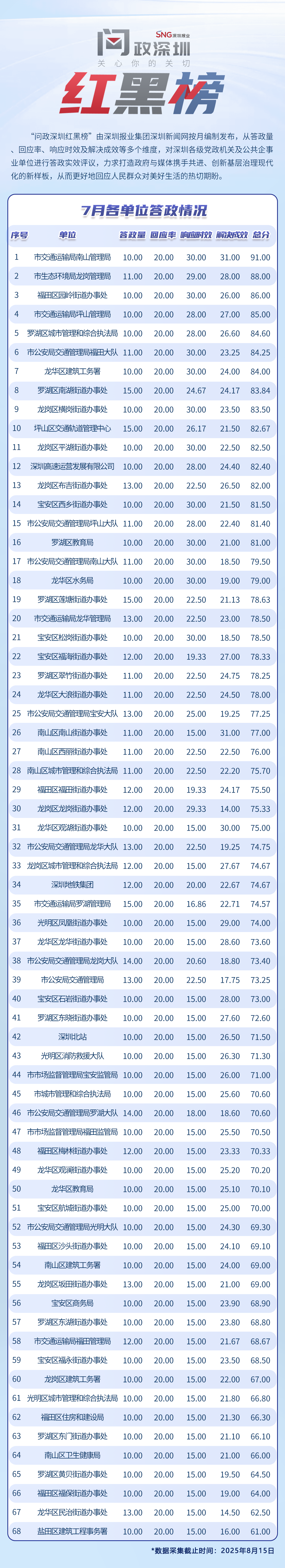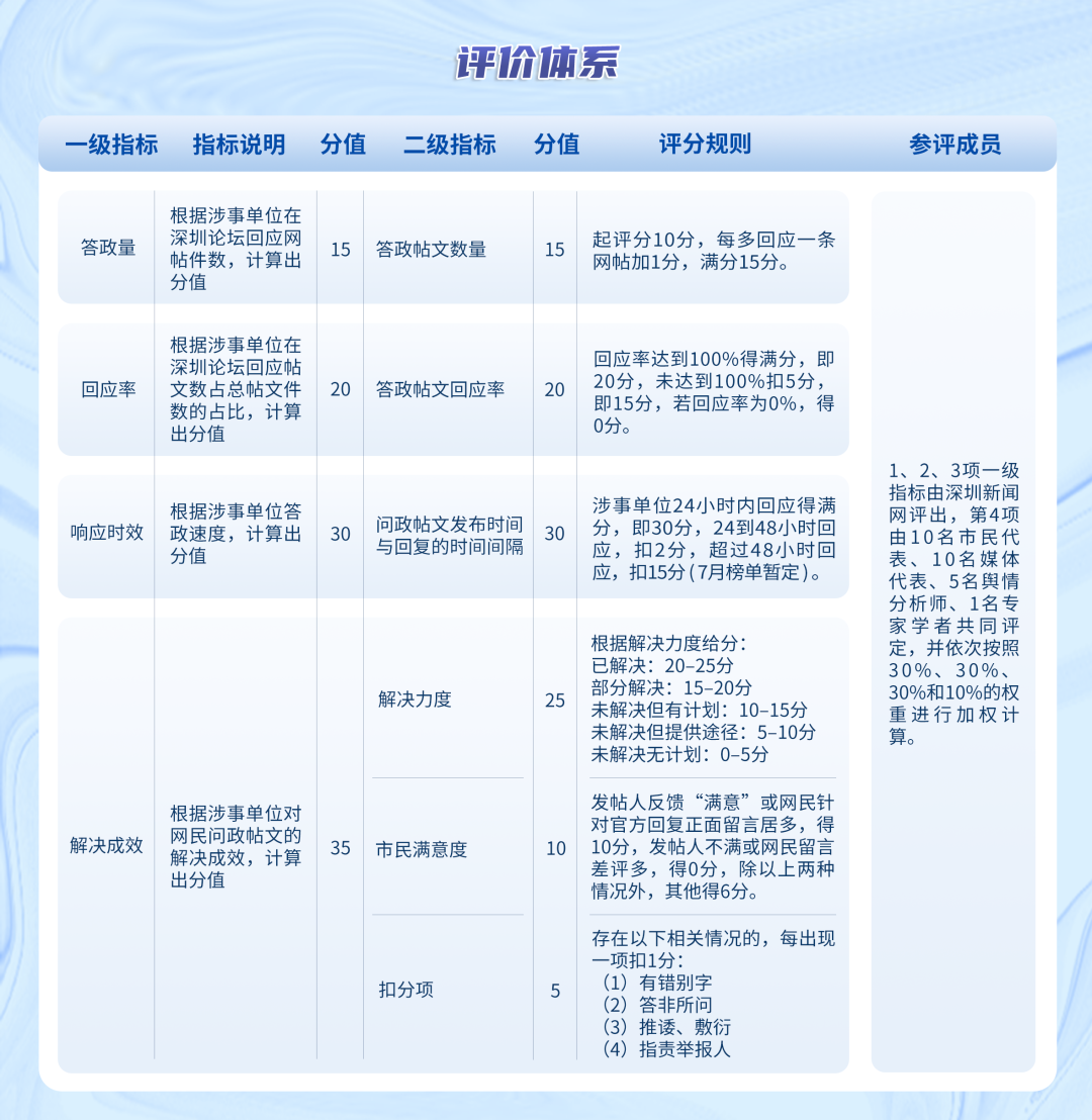 “問政深圳紅黑榜”具有科學(xué)、合理、完備的綜合評(píng)價(jià)體系,能夠綜合評(píng)估深圳各級(jí)黨政機(jī)關(guān)和公共企事業(yè)單位的答政情況。