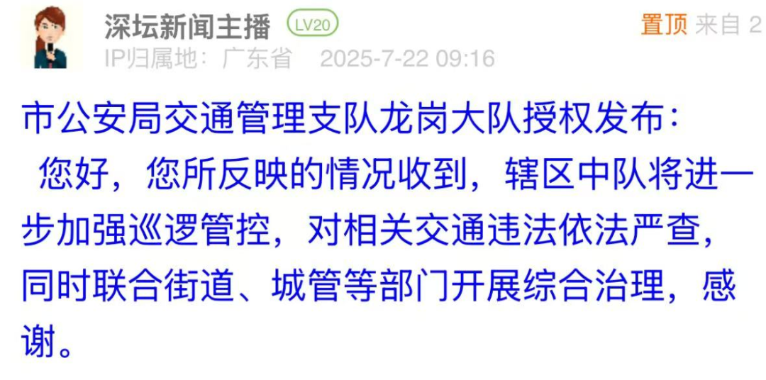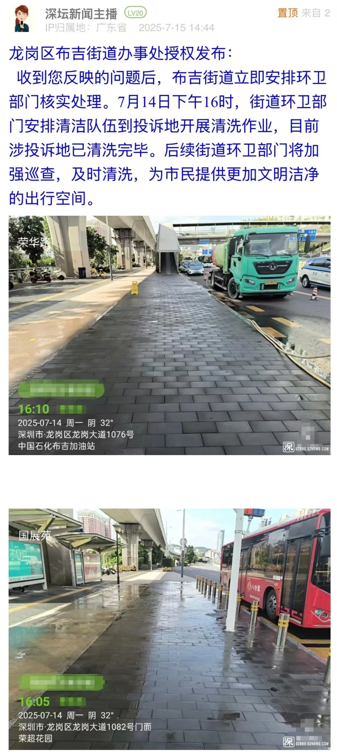 案例點(diǎn)評(píng):對(duì)于市民反映的路面油污問題,布吉街道辦立即安排環(huán)衛(wèi)部門進(jìn)行清洗,并于第二日在問政帖文下進(jìn)行回復(fù),以現(xiàn)場圖片展示路面清理效果,表示將加強(qiáng)后續(xù)巡查。此次處置展現(xiàn)了基層部門高效務(wù)實(shí)的問題處理能力,為城市道路環(huán)境管理提供了快速響應(yīng)與長效維護(hù)相結(jié)合的實(shí)踐范例,切實(shí)回應(yīng)了市民對(duì)潔凈環(huán)境的期待。
