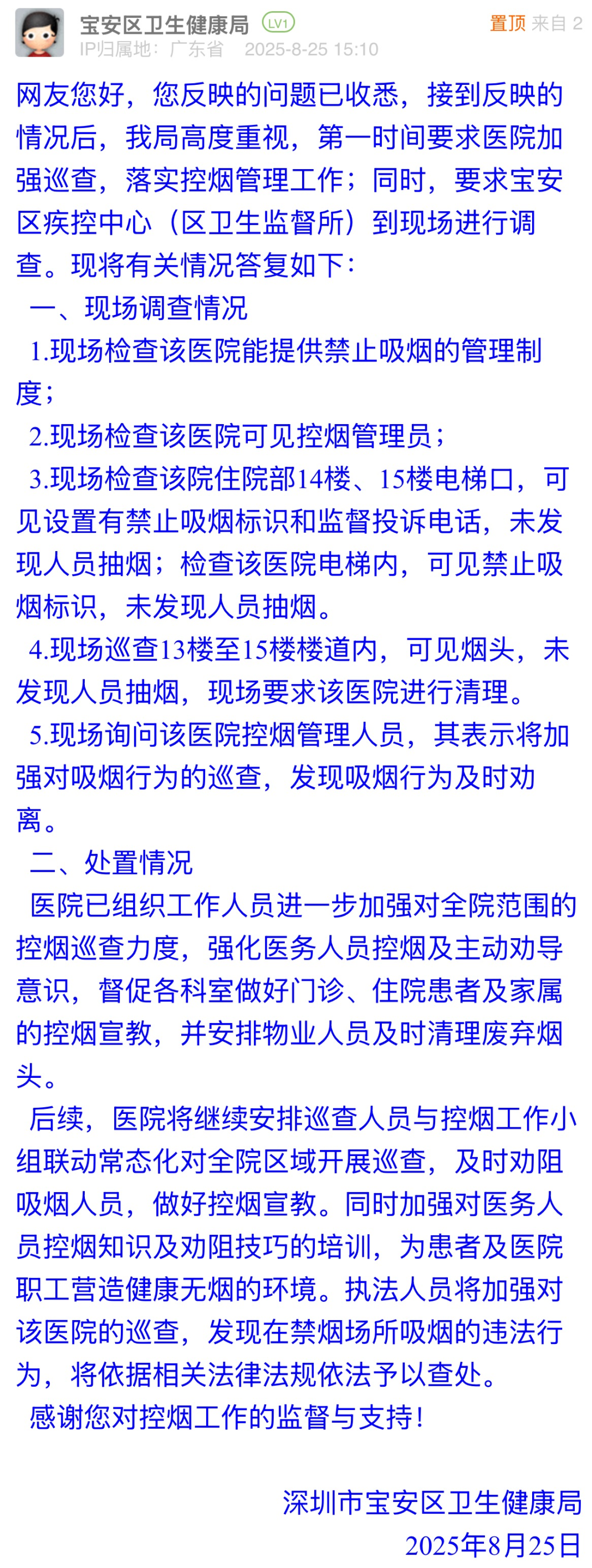 優(yōu)化建議:接到市民反饋后,寶安區(qū)衛(wèi)生健康局快速組織現(xiàn)場(chǎng)調(diào)查,核實(shí)醫(yī)院有禁煙制度、控?zé)煿芾韱T在崗,基礎(chǔ)控?zé)煷胧┖瞬榈轿?,值得點(diǎn)贊。但回應(yīng)中多次強(qiáng)調(diào)“未發(fā)現(xiàn)人員抽煙”,回避對(duì)歷史吸煙行為處置、煙頭來(lái)源及勸阻機(jī)制失效的解釋,與市民關(guān)切脫節(jié),難以消除市民對(duì)醫(yī)院日???zé)熌芰Φ膿?dān)憂,建議完善具體控?zé)煷胧缂友b煙感報(bào)警裝置,建立核查公示制度等,筑牢“無(wú)煙醫(yī)院”防線。
