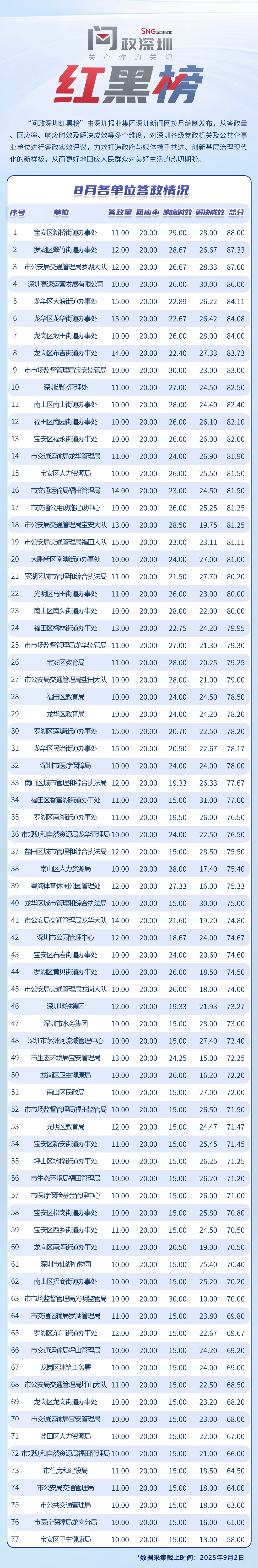 為探尋媒體如何精準(zhǔn)賦能基層治理現(xiàn)代化的“深圳路徑”,深圳報(bào)業(yè)集團(tuán)正式掛牌成立“問(wèn)政深圳”工作室,旨在進(jìn)一步推動(dòng)網(wǎng)絡(luò)問(wèn)政工作的高效開展。為確保相關(guān)工作更加契合實(shí)際需求,自上期起,深圳報(bào)業(yè)集團(tuán)深圳新聞網(wǎng)按照“最快速度辦結(jié)”的總體要求,將原有月度榜單創(chuàng)新升級(jí)為“問(wèn)政深圳紅黑榜”,并對(duì)評(píng)分體系進(jìn)行了細(xì)致優(yōu)化。該榜單從答政量、回應(yīng)率、響應(yīng)時(shí)效及解決成效等多個(gè)維度,對(duì)深圳各級(jí)黨政機(jī)關(guān)及公共企事業(yè)單位進(jìn)行答政實(shí)效評(píng)議,力求打造政府與媒體攜手共進(jìn)、創(chuàng)新基層治理現(xiàn)代化的新樣板,從而更好地回應(yīng)人民群眾對(duì)美好生活的熱切期盼。