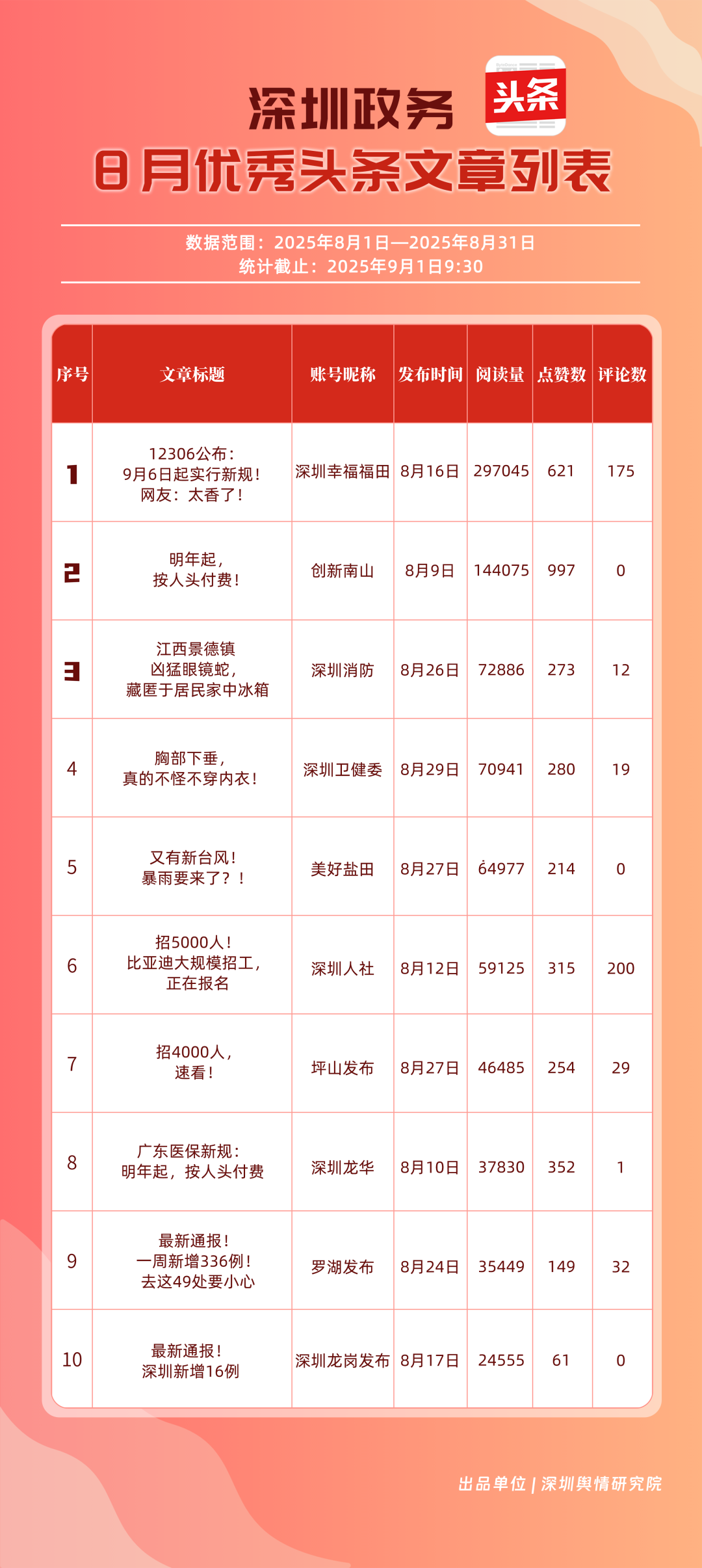 8月,“深圳幸福福田”“深圳消防”“深圳衛(wèi)健委”“創(chuàng)新南山”“深圳人社”“羅湖發(fā)布”“深圳龍崗發(fā)布”“深圳龍華”“青春深圳”“坪山發(fā)布”共10個(gè)政務(wù)頭條號(hào)入選“優(yōu)秀政務(wù)頭條號(hào)”榜單?!吧钲谛腋8L铩睉{借持續(xù)優(yōu)異的綜合表現(xiàn),以滿分成績(jī)穩(wěn)居榜單首位,彰顯出強(qiáng)大的政務(wù)傳播力與影響力;“深圳消防”“深圳衛(wèi)健委”則以穩(wěn)定的內(nèi)容質(zhì)量與深厚的民眾基礎(chǔ),持續(xù)為市民提供權(quán)威、及時(shí)的服務(wù)信息,排名穩(wěn)固?!皠?chuàng)新南山”“深圳人社”等上榜賬號(hào)亦表現(xiàn)亮眼,聚焦民生服務(wù)傳遞政策溫度,共同構(gòu)成政務(wù)新媒體矩陣的中堅(jiān)力量,為城市治理與民生服務(wù)注入鮮活動(dòng)能。