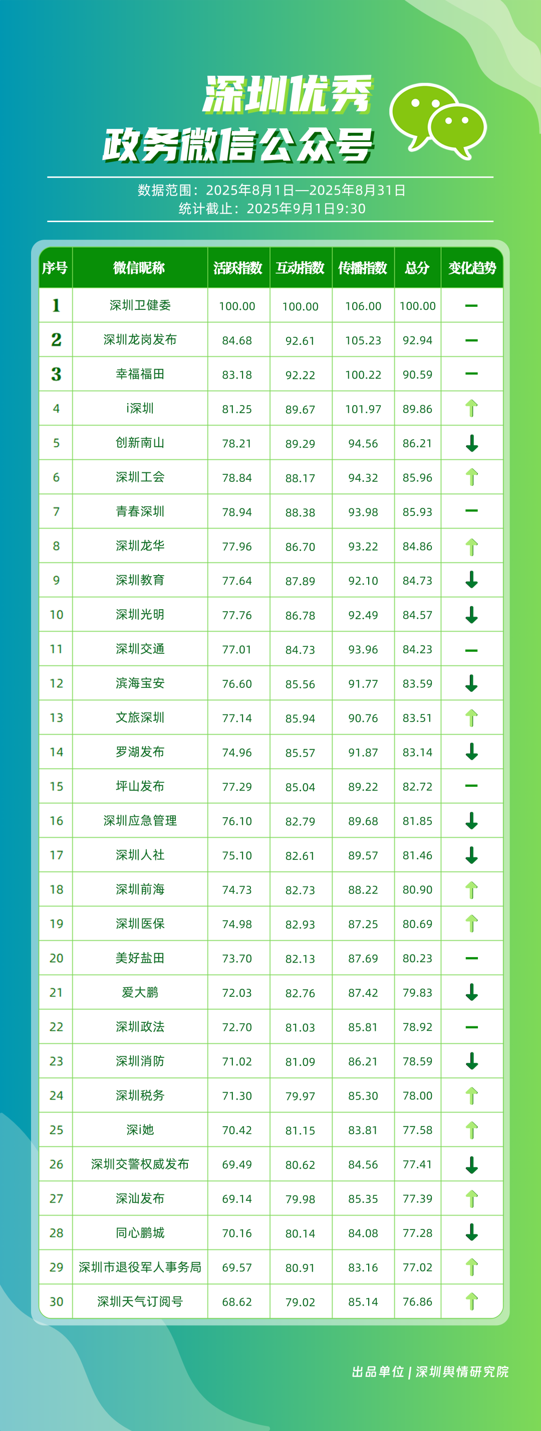 8月,30個(gè)政務(wù)微信公眾號(hào)入選“深圳優(yōu)秀政務(wù)微信公眾號(hào)”榜單,其中包括“深圳衛(wèi)健委”“深圳龍崗發(fā)布”“幸福福田”“i深圳”“創(chuàng)新南山”“深圳工會(huì)”“青春深圳”“深圳龍華”“深圳教育”“深圳光明”等。8月,“深圳衛(wèi)健委”66篇推文獲得超10萬(wàn)次閱讀,以滿分位于榜單首位;“深圳龍崗發(fā)布”積極傳遞民生信息,依托區(qū)域活動(dòng)開展宣傳,推動(dòng)傳播效果顯著提升,位居第二;“幸福福田”關(guān)注區(qū)域發(fā)展動(dòng)態(tài),排名第三?!癷深圳”“創(chuàng)新南山”“深圳工會(huì)”“青春深圳”等政務(wù)賬號(hào)在信息發(fā)布中不斷提升內(nèi)容豐富性,深耕優(yōu)質(zhì)服務(wù),評(píng)分在85分以上。上榜微信公眾號(hào)立足自身特色優(yōu)勢(shì),以精品內(nèi)容為核心競(jìng)爭(zhēng)力,在政務(wù)傳播領(lǐng)域樹立了標(biāo)桿形象,成為兼具影響力與公信力的示范樣本。