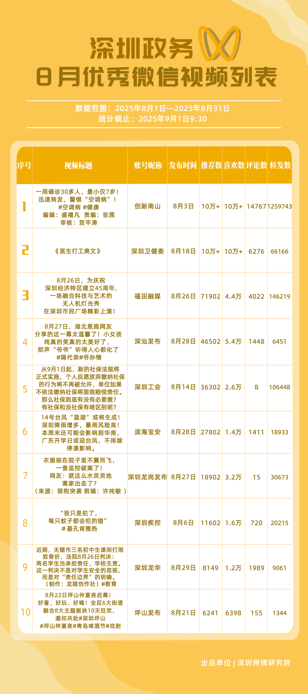 8月,獲得“深圳優(yōu)秀政務(wù)微信視頻號(hào)”稱號(hào)的是“創(chuàng)新南山”“深圳衛(wèi)健委”“深汕發(fā)布”“福田融媒”“深圳龍崗發(fā)布”“濱海寶安”“深圳工會(huì)”“深圳龍華”“青春深圳”“深圳天氣”。其中,“創(chuàng)新南山”一視頻提醒市民警惕“空調(diào)病”,獲百萬(wàn)次轉(zhuǎn)發(fā),賬號(hào)憑借該視頻位列榜單第一名;“深圳衛(wèi)健委”視頻“醫(yī)生打工爽文”“傷痛蚊學(xué)”等作品在微信視頻號(hào)平臺(tái)獲得較好數(shù)據(jù),助推其位列榜單第二名;“深汕發(fā)布”在內(nèi)容互動(dòng)性上獲得較好成效,單項(xiàng)指標(biāo)得分達(dá)到100分,以92.01的評(píng)分位列榜單第三名?!案L锶诿健薄吧钲邶垗彴l(fā)布”等賬號(hào)也獲得不錯(cuò)成績(jī),上榜微信視頻號(hào)依托平臺(tái)的傳播優(yōu)勢(shì),用簡(jiǎn)短視頻呈現(xiàn)各類信息,打造政務(wù)宣傳的亮眼名片。