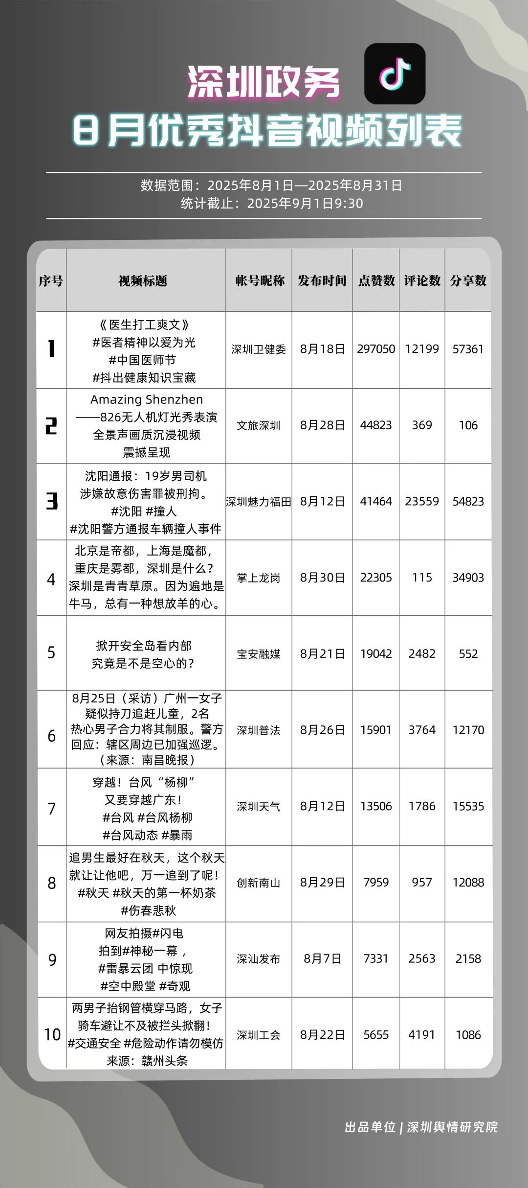 8月,“深圳衛(wèi)健委”“深汕發(fā)布”“深圳魅力福田”“深圳天氣”“掌上龍崗”“DOU愛龍華”“創(chuàng)新南山”“深圳普法”“文旅深圳”“美好鹽田”共10個(gè)政務(wù)抖音號(hào)獲得“優(yōu)秀政務(wù)抖音號(hào)”稱號(hào)?!吧钲谛l(wèi)健委”內(nèi)容吸引大量網(wǎng)民關(guān)注,4條視頻累計(jì)獲得超50萬(wàn)次點(diǎn)贊,排名從上期的第九名上升至第一名;“深汕發(fā)布”憑借較高的傳播指數(shù)評(píng)分,位列第二名,排名有所上升。“深圳魅力福田”“深圳天氣”等賬號(hào)緊隨其后,得分均在95分左右。上榜的優(yōu)秀政務(wù)抖音號(hào)深耕優(yōu)質(zhì)創(chuàng)作,精準(zhǔn)把握網(wǎng)民興趣點(diǎn),使作品收獲高點(diǎn)贊、高轉(zhuǎn)發(fā),推動(dòng)評(píng)論區(qū)形成良性互動(dòng)氛圍,以優(yōu)秀內(nèi)容提升政務(wù)傳播效能。