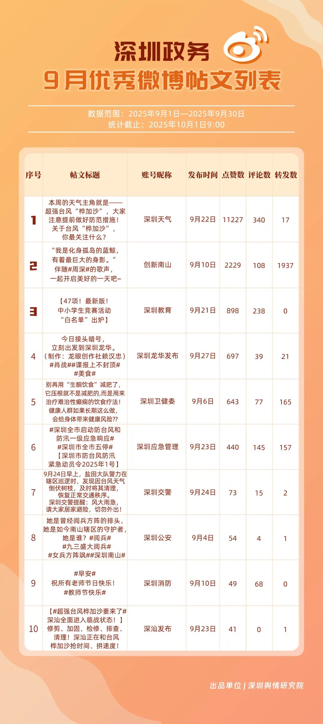 9月,20個賬號入選“優(yōu)秀政務微博號”榜單,其中包括:“深圳天氣”“創(chuàng)新南山”“深圳龍崗發(fā)布”“深圳衛(wèi)健委”“深圳消防”“深圳應急管理”“福田發(fā)布”“深圳公安”“深圳交警”“深圳教育”等。其中,“深圳天氣”蟬聯(lián)榜首,尤其9月出現(xiàn)臺風天氣,賬號受關注度再提升;“創(chuàng)新南山”賬號以多維度內容策略實現(xiàn)傳播效能提升,其內容中與歌手周深的聯(lián)動也成為一大亮點,獲得了較好傳播效果,以94.34分排名榜單第二;“深圳龍崗發(fā)布”“深圳衛(wèi)健委”兩賬號得分均在93分以上,在區(qū)域宣傳、內容科普方向發(fā)力。上榜優(yōu)秀微博賬號展現(xiàn)出較高的內容創(chuàng)新能力,以年輕化語態(tài)構建傳播體系,形成兼具專業(yè)性與傳播力的優(yōu)秀案例。