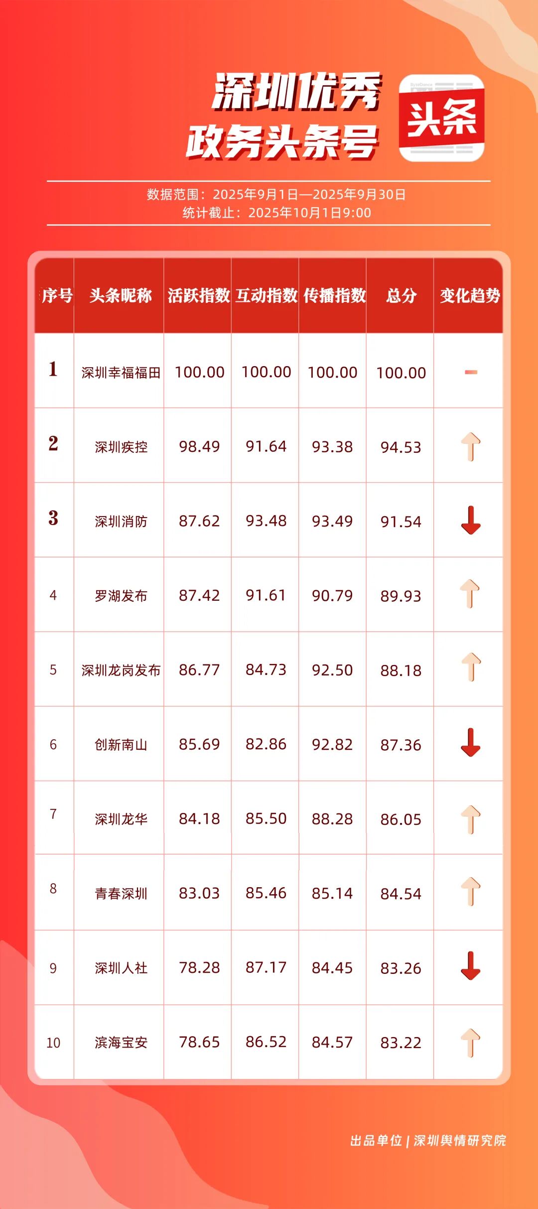 9月,“深圳幸福福田”“深圳疾控”“深圳消防”“羅湖發(fā)布”“深圳龍崗發(fā)布”“創(chuàng)新南山”“深圳龍華”“青春深圳”“深圳人社”“濱海寶安”共10個政務頭條號入選“優(yōu)秀政務頭條號”榜單?!吧钲谛腋8L铩狈€(wěn)居榜單首位,在傳播、互動等方面均表現(xiàn)卓越;“深圳疾控”關注民生健康,有關“喝茶的好處”“非正規(guī)醫(yī)美針風險”兩篇文章閱讀均超10萬次,為市民提供健康信息;“深圳消防”聚焦消防安全領域,提醒市民注意安全。相關上榜賬號表現(xiàn)優(yōu)異,注重內容實用化、互動場景化,彰顯了政務新媒體的服務效能。