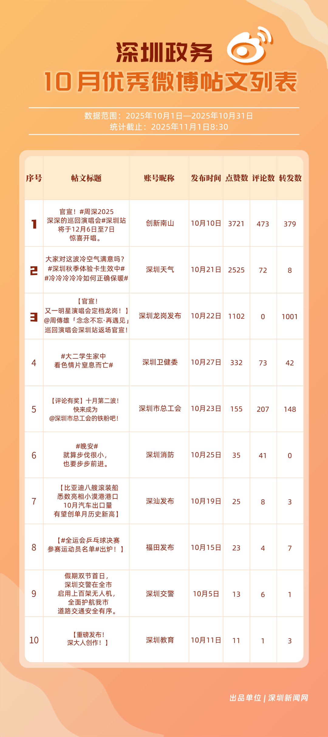 10月,20個賬號入選“優(yōu)秀政務微博號”榜單,其中包括:“深圳天氣”“深圳龍崗發(fā)布”“深圳市總工會”“深圳消防”“創(chuàng)新南山”“福田發(fā)布”“深圳衛(wèi)健委”“深汕發(fā)布”“深圳應急管理”“深圳公安”等。其中,“深圳天氣”高頻、及時地發(fā)布天氣相關內(nèi)容,其中多篇關于“冷空氣”“入秋”帖文收獲較好互動和傳播效果,以100分位列榜單首位;“深圳龍崗發(fā)布”總分97.37分,居于榜單第二,其有關演唱會定檔、卷尺哥等內(nèi)容的帖文獲得較好數(shù)據(jù);“深圳市總工會”關注職工日常生活,以97.03分居于榜單第三?!吧钲谙馈薄皠?chuàng)新南山”等微博賬號也通過各自的特色內(nèi)容,展現(xiàn)深圳城市治理、民生服務的溫度。