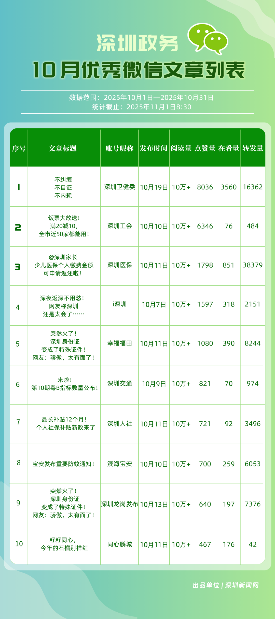 10月,“深圳衛(wèi)健委”“深圳龍崗發(fā)布”“i深圳”“幸福福田”“深圳工會”“青春深圳”“創(chuàng)新南山”“濱海寶安”“深圳龍華”“深圳光明”等30個政務微信公眾號榮登“深圳優(yōu)秀政務微信公眾號”榜單。10月,“深圳衛(wèi)健委”以總分100位居榜首,其持續(xù)以真誠、反套路的內(nèi)容,將專業(yè)健康知識轉化為網(wǎng)民喜聞樂見的“生活指南”,受到大量網(wǎng)民喜愛;“深圳龍崗發(fā)布”位居第二,持續(xù)發(fā)布高質(zhì)量內(nèi)容,成為市民獲取龍崗動態(tài)的“第一窗口”;“i深圳”也發(fā)布政策、民生內(nèi)容,排名有所上升,位列第三;“幸福福田”“深圳工會”等也立足區(qū)域特色,通過多元內(nèi)容,展現(xiàn)各自的發(fā)展活力。