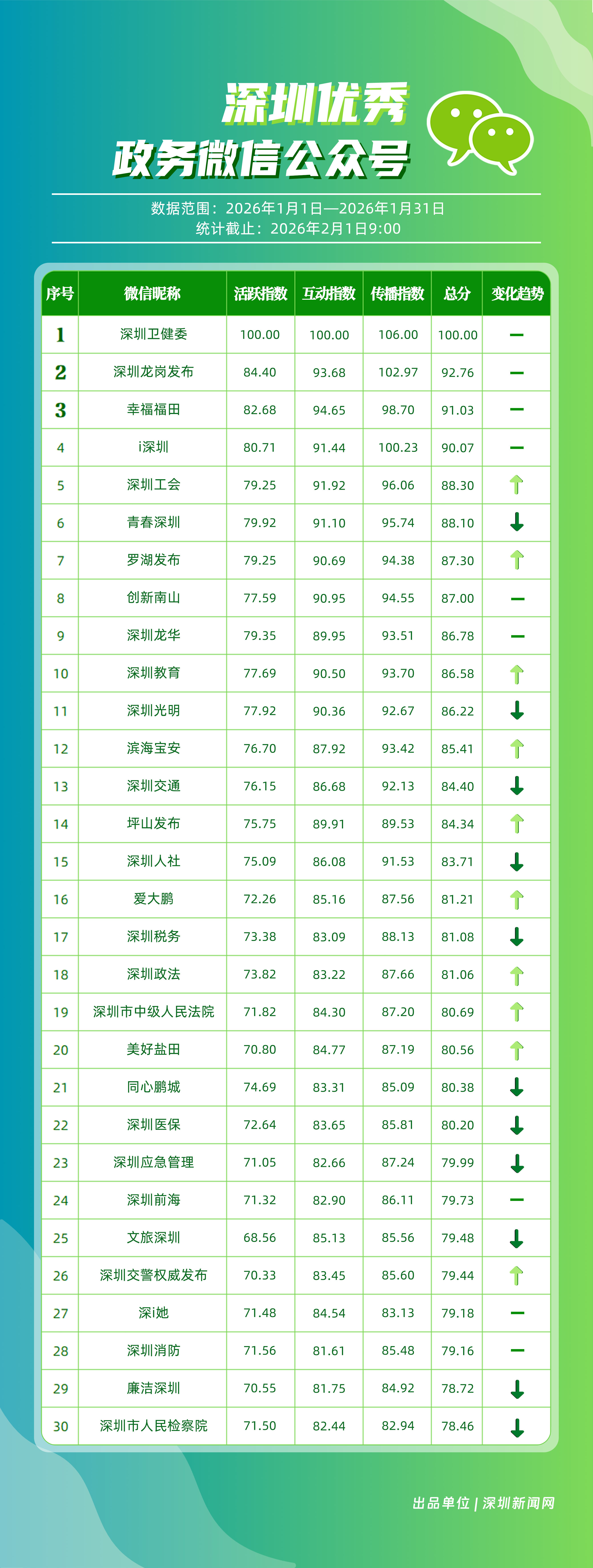 2026年1月,“深圳衛(wèi)健委”“深圳龍崗發(fā)布”“幸福福田”“i深圳”“深圳工會”“青春深圳”“羅湖發(fā)布”“創(chuàng)新南山”“深圳龍華”“深圳教育”等30個政務(wù)微信公眾號榮登“深圳優(yōu)秀政務(wù)微信公眾號”榜單。1月,頭部賬號“深圳衛(wèi)健委”繼續(xù)保持領(lǐng)先優(yōu)勢,1月份有59篇文章閱讀量突破10萬次,總分100分,穩(wěn)居榜首;“深圳龍崗發(fā)布”在互動與傳播方面表現(xiàn)依然出色,總分102.97分,位列第二;“幸福福田”憑借均衡、穩(wěn)健的運營,在互動與傳播方面表現(xiàn)優(yōu)異,總分91.03分,排名第三。同時,“深圳工會”與“羅湖發(fā)布”等賬號排名相較2025年12月有所提升。上榜微信公眾號持續(xù)深耕內(nèi)容與服務(wù),不斷拓展發(fā)布維度與深化應(yīng)用場景,在提升政務(wù)信息傳播效能、精準對接民生需求方面,發(fā)揮了關(guān)鍵作用。