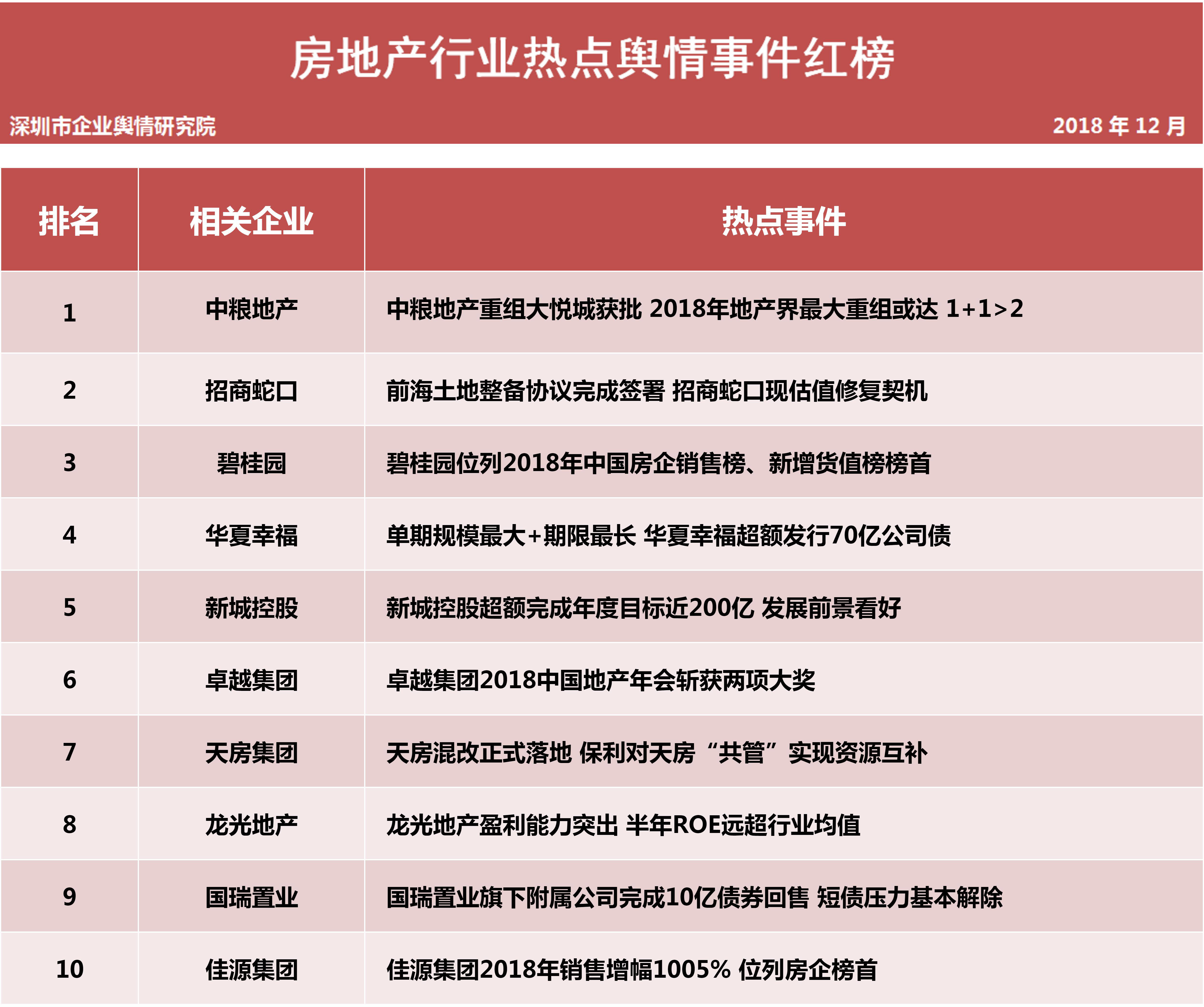 近日深圳企業(yè)輿情研究院發(fā)布第五批企業(yè)輿情榜單。本次榜單重點(diǎn)聚焦房地產(chǎn)及醫(yī)藥保健兩個(gè)行業(yè)。房地產(chǎn)行業(yè)企業(yè)輿情榜單由房地產(chǎn)行業(yè)熱點(diǎn)輿情事件排行榜(紅、黑榜)及房地產(chǎn)企業(yè)公眾形象排行榜組成。